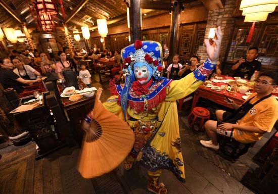 圖為食客在四川省成都市寬窄巷子景區(qū)內(nèi)的一家火鍋店觀看“變臉”表演。新華社記者 劉坤 攝