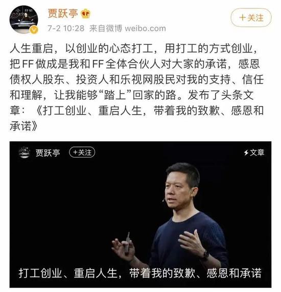 7月2日,樂視網(wǎng)、法拉第未來(Faraday Future)創(chuàng)始人賈躍亭在個(gè)人微博發(fā)布公開信,宣布其在美國申請的個(gè)人破產(chǎn)重組最終完成,重組方案正式生效,債權(quán)人信托也隨之正式設(shè)立并開始運(yùn)營。